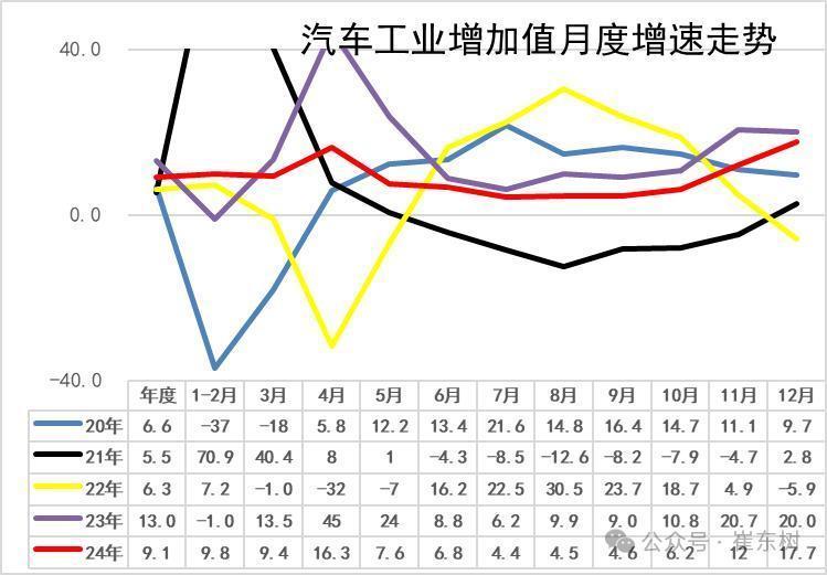 2020年汽车工业增加值增6.6%,2021年增速徘徊在5.5%的水平,2022年的汽车增加值6.3%,较强。2023年汽车业增加值增13%,实现超强增长。2024年1-12月的9.1%的汽车增加值相对提升较好,12月份的17.7%环比增5.7个百分点,表现较好。