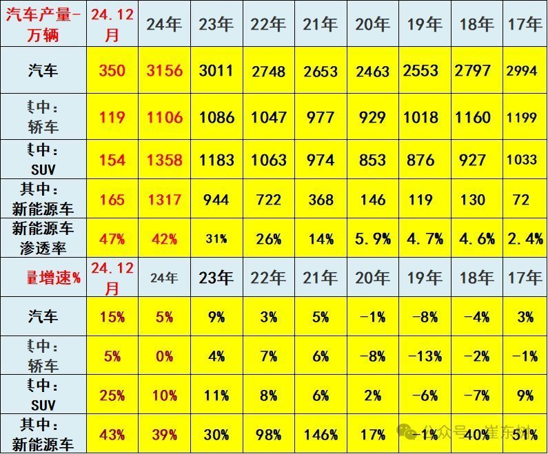 2024年12月汽车生产350万台,同比增15%;新能源汽车生产165万台,同比增43%,渗透率47%。1-12月汽车生产3156万台,同比增长5%;新能源汽车生产1317万台,同比增39%,渗透率42%,这是实现加速的增长。