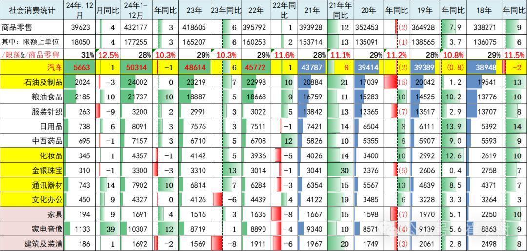 12月份,社会消费品零售总额45172亿元,同比增长3.7%。其中,汽车消费额5663亿元、同比增1%,汽车占比12.5%;除汽车以外的消费品零售额39509亿元,增长4.2%。2024年,社会消费品零售总额487895亿元,比上年增长3.5%。其中,汽车消费额50314亿元、同比降0.5%,占比10.3%;除汽车以外的消费品零售额437581亿元,增长3.8%。