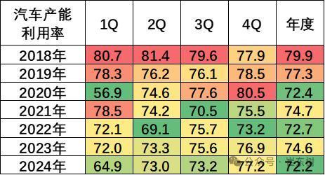 2024年一季度,全国规模以上工业产能利用率为73.6%;2024年二季度,全国规模以上工业产能利用率为74.9%,比上年同期上升0.4个百分点,比一季度上升1.3个百分点。汽车制造业2024年2季度73%,比上年同期下降0.3个百分点,比上季度增长8个百分点。2024年三季度汽车行业产能利用率73.2%,较同期下降2.4个百分点,汽车产能利用率偏低。2024年四季度汽车行业产能利用率77.2%,较同期上升0.3个百分点,汽车产能利用率很好。