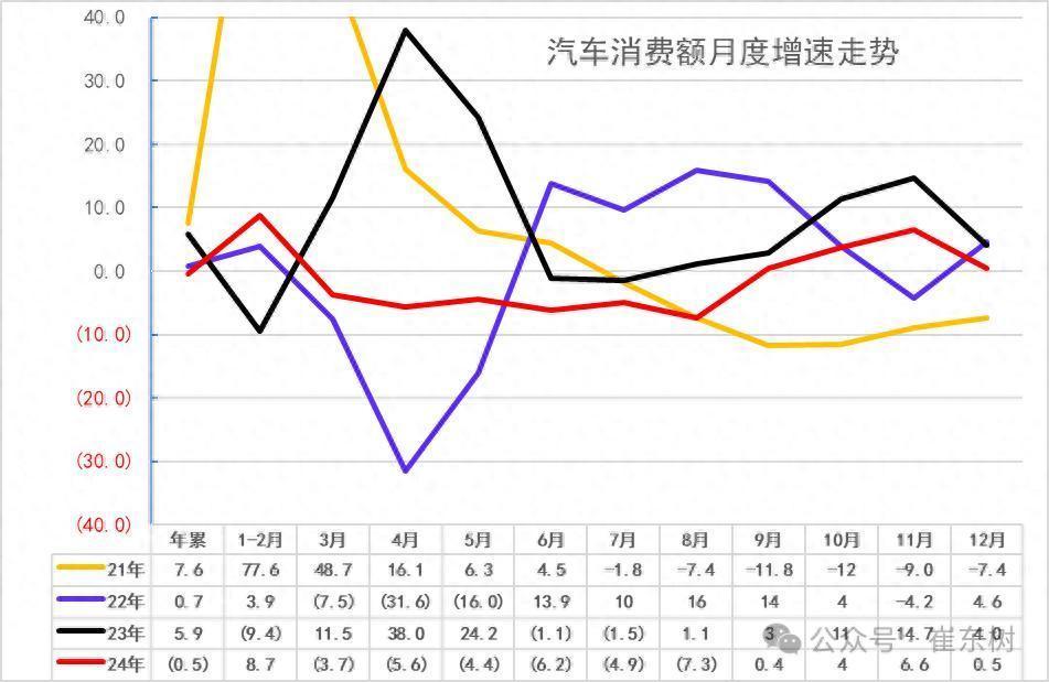 目前看消费不旺的问题稍有改善,2024年1-12月汽车消费出现负增长,没有跟上商品零售的平均增速,未来高基数的增长压力仍较大。